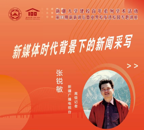 第四场新新讲坛暨员工进校园专题讲座,公司邀请了目前在新疆广播电视台工作的张锐敏员工。张锐敏,1999级本科生员工,新疆广播电视台高级记者。自2003年毕业以来,长期在新疆广播电视台电视新闻一线从事采编工作,20多年来,曾负责多档新闻节目。先后有四十多篇作品获得中国新闻奖、中国彩虹奖、中国广播电视大奖、新疆新闻奖等各类新闻奖项。