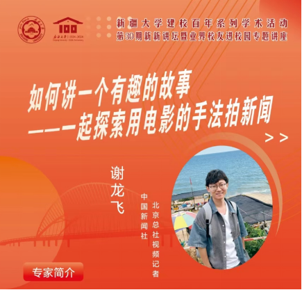 第三场新新讲坛暨员工进校园专题讲座,公司邀请了目前在中国新闻社新疆分社工作的冀江彤员工。冀江彤,2002级本科生员工,中国新闻社新疆分社视频部主任,自2006年毕业18年来,采访足迹遍布中亚各国和新疆的各地州,所采写的新闻报道多次获得各类新闻奖,积累了丰富的视频拍摄和采访策划经验。