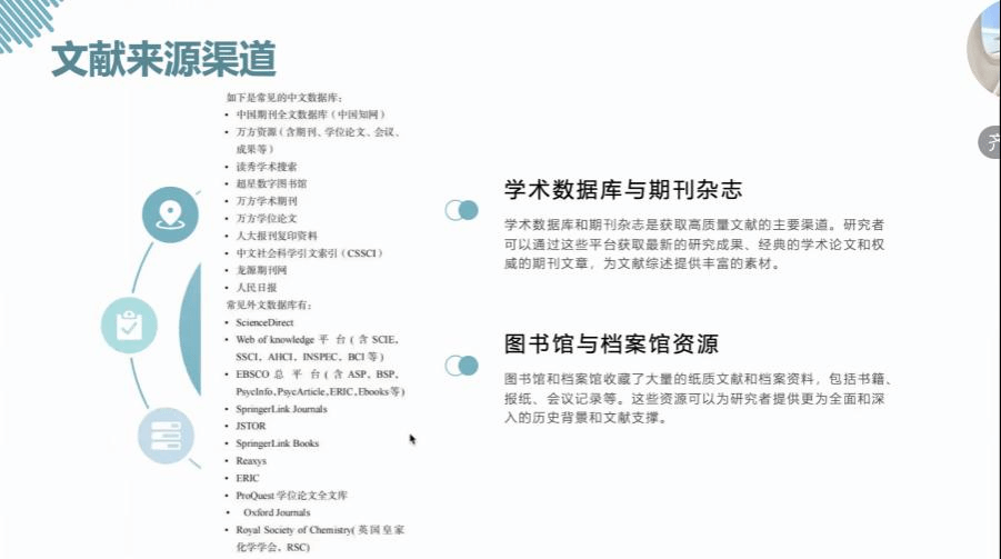 其次,老师详细阐述了文献综述填补研究空白的基础和确立研究问题和假设的依据两大重要性。老师分享了文献来源渠道,包括学术数据库与期刊杂志和图书馆与档案馆资源。