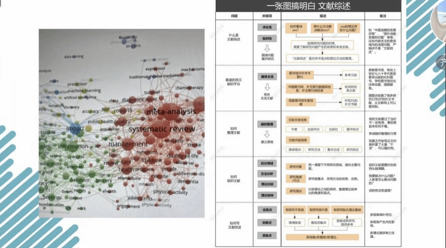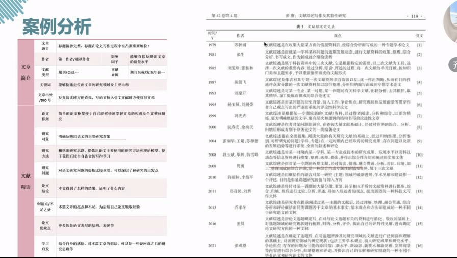 另外,老师还分享整理文献综述的小技巧,老师指出可以通过表格的形式进行整理,大致罗列出发表时间,作者,发表的期刊,关键词,观点。老师在最后强调整理文献综述是一个循序渐进的过程,尽早着手去做,在做的过程中多与老师沟通,整理自己阅读的论文,整理成一个模板。