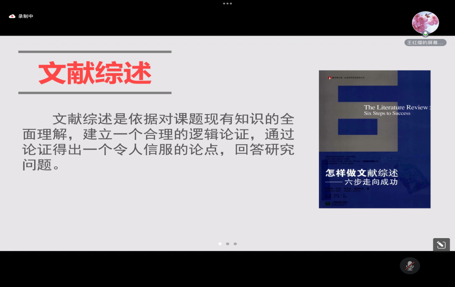 王琴琴老师总结和补充了王红缨老师所讲述的内容,分享了自己在文献综述撰写方面的心得,王老师提出研究综述是一项基础性工作,能体现研究问题是否有价值和意义,为进一步研究提供基础,研究综述可以帮助研究人员了解某个领域的现有研究成果,并在此基础上开展新的研究。并鼓励同学们利用暑期时间广泛阅读文献,开展文献综述撰写工作,为论文写作打好基础。